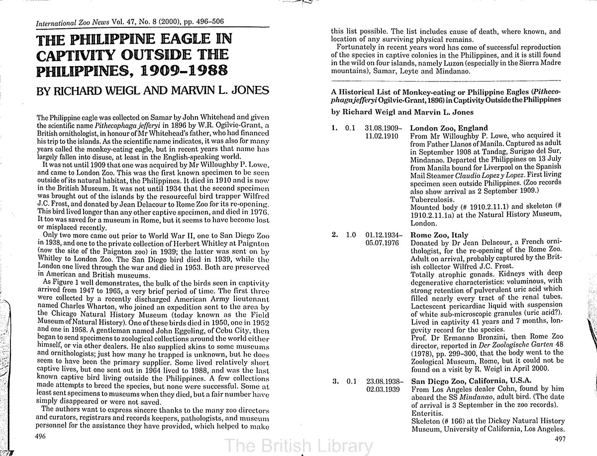 A painting of the Monkey-Eating Eagle, painted by George Edward Lodge in 1944, hangs at the second floor of ZSL Library and Archives. The eagle is also featured in several books about raptors in the library.