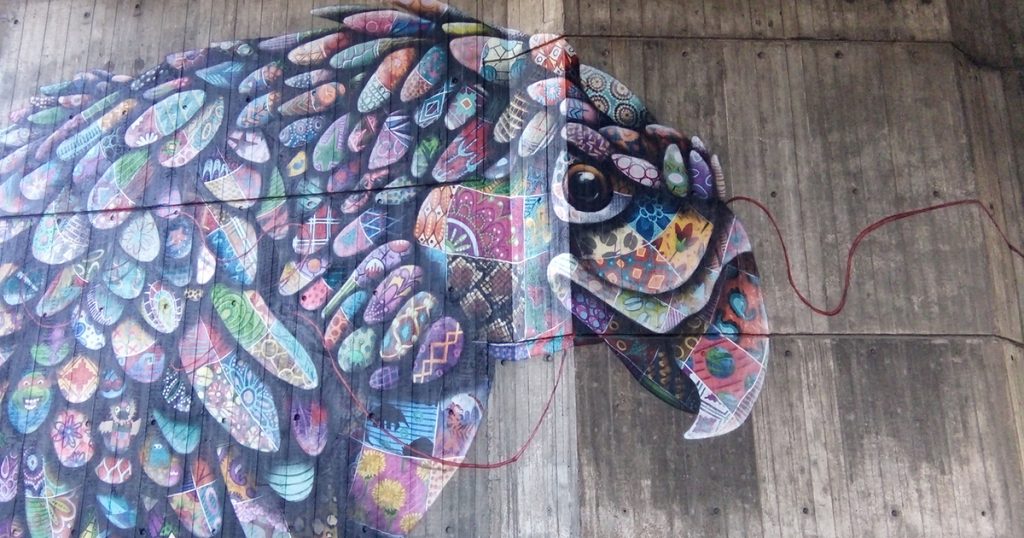 At London Zoo, street artist Louis Masai has painted a large, colourful, patterned mural of the Philippine eagle.